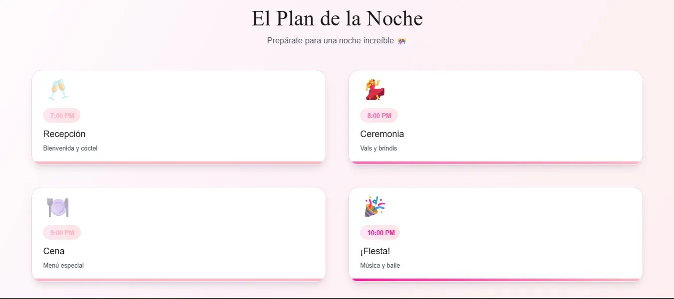Diseño interfaces visuales limpias y agradables que acompañan el estilo del evento. Con navegación simple e intuitiva, permitiendo que cualquier invitado encuentre la información sin esfuerzo y disfrute de una experiencia digital clara y cuidada.