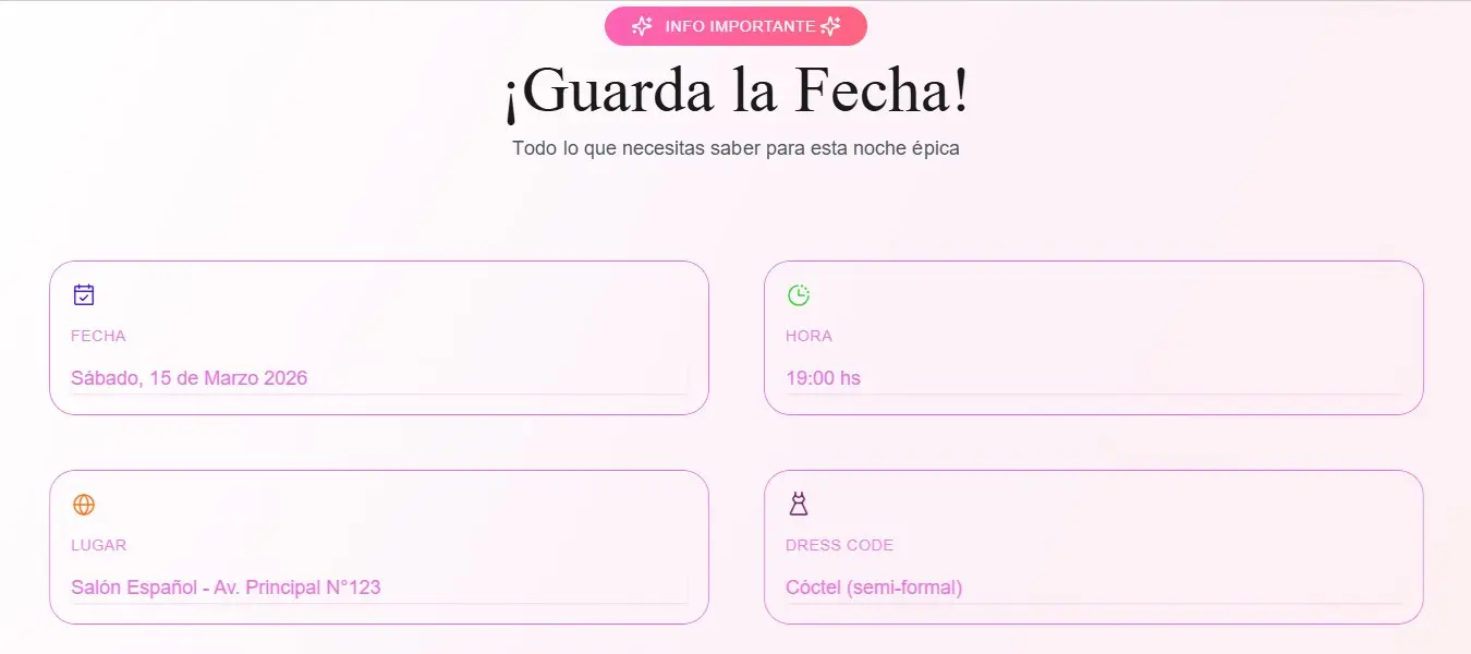Landing digital diseñada para comunicar un cumpleaños de 15 de forma clara y estética.